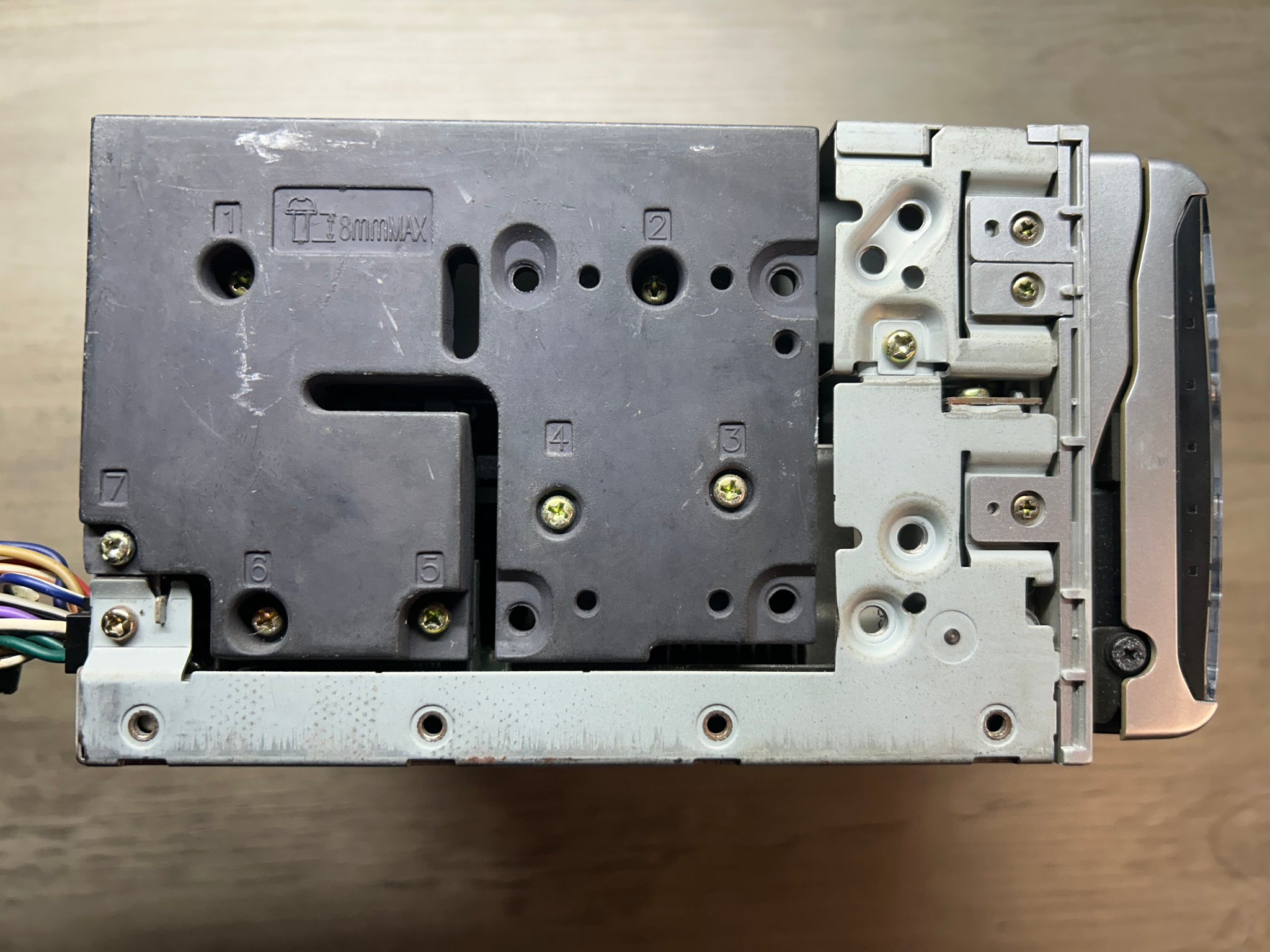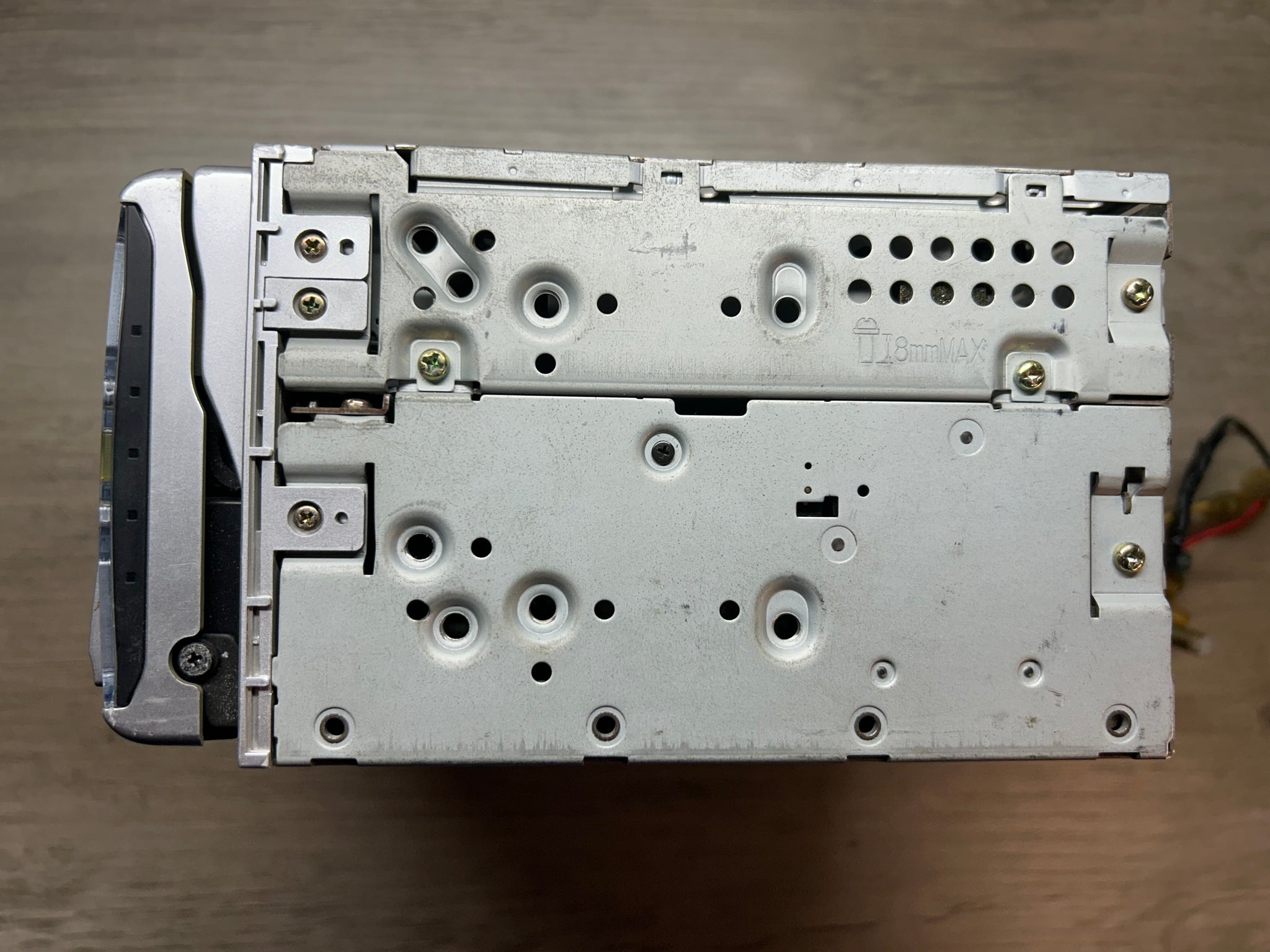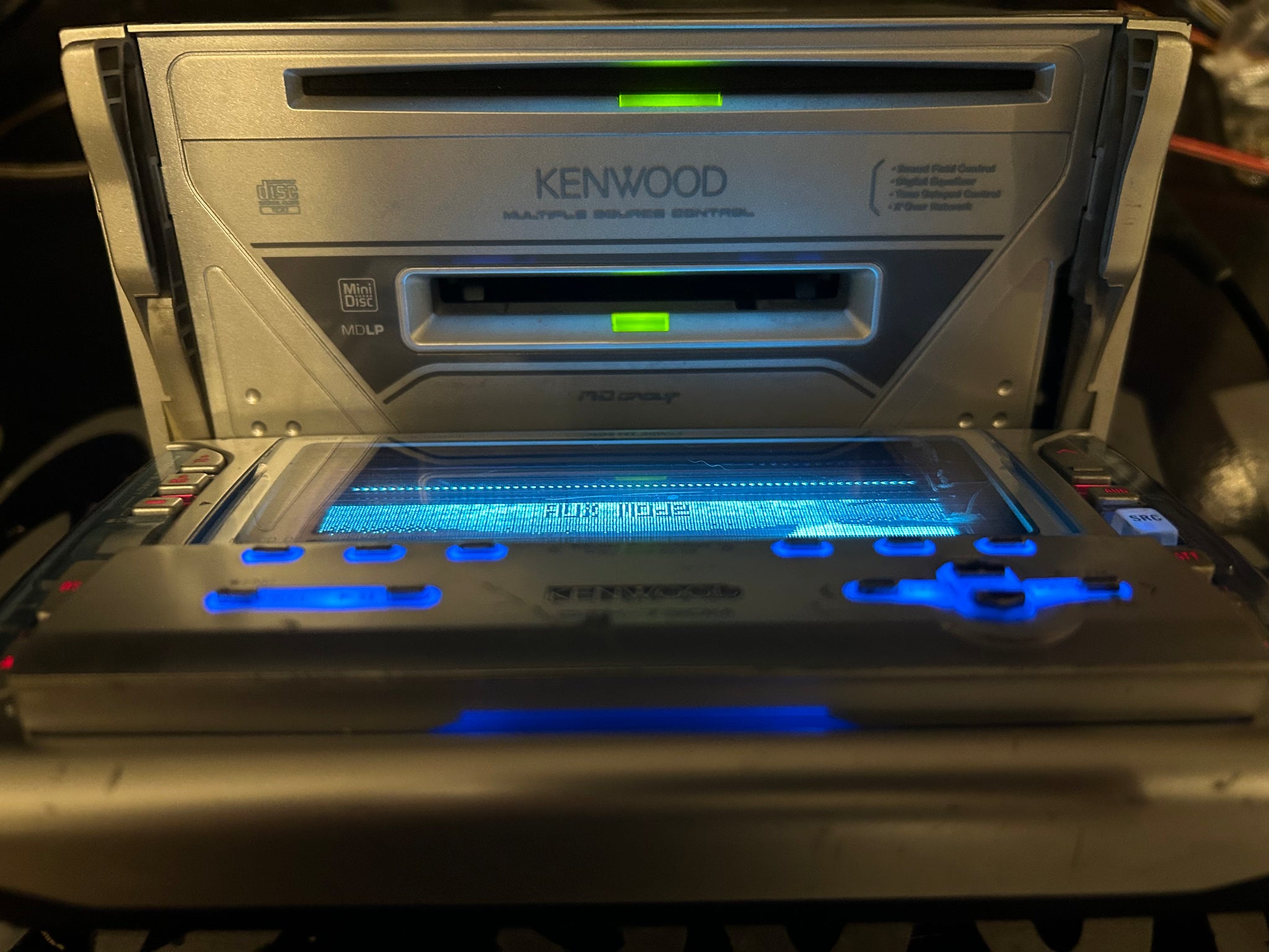 - Motorized face with angle adjustment flips down for CD/MD access