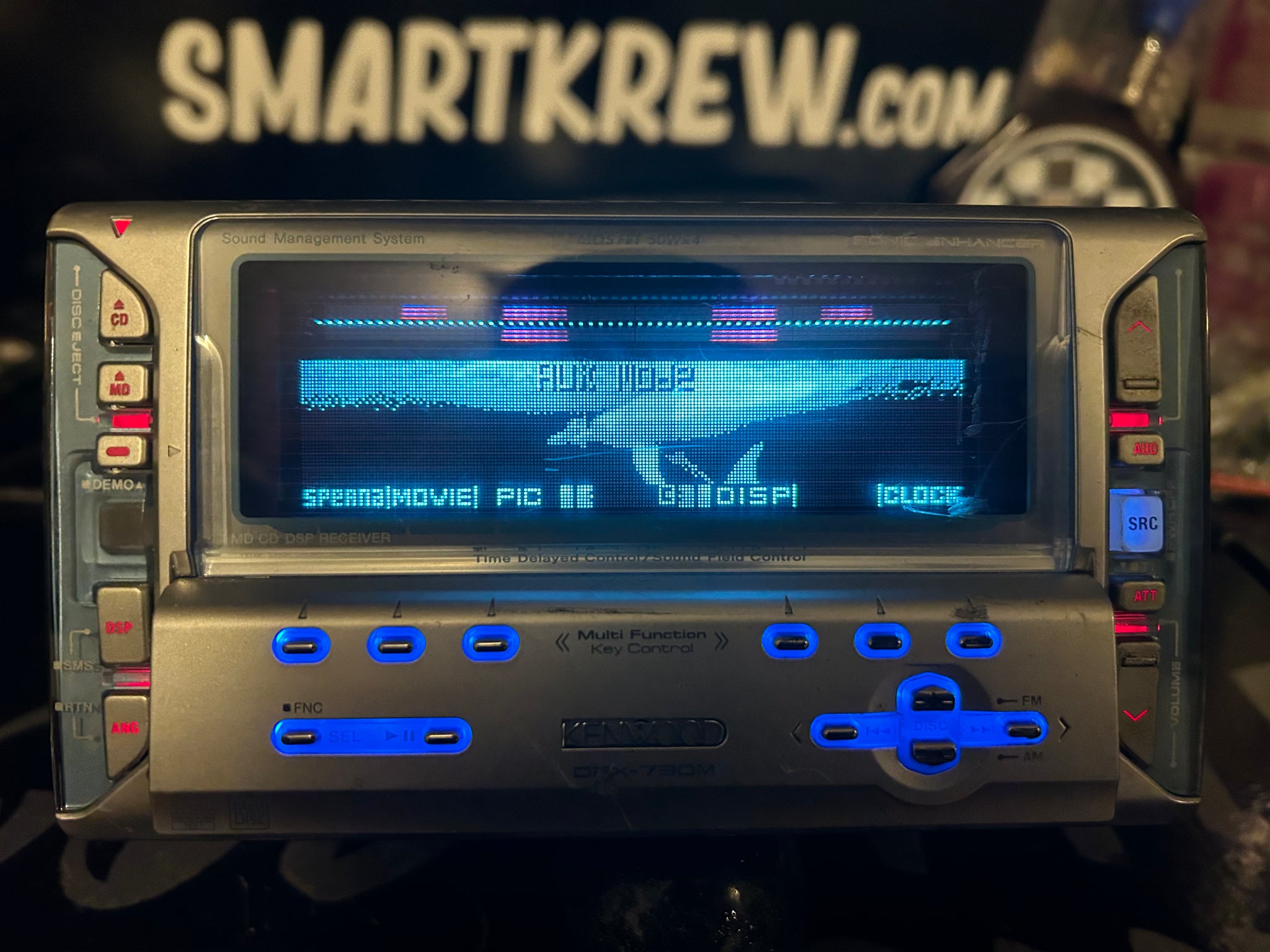 - Animated display with multiple spectrum analyzers, moving graphics, and still photo options